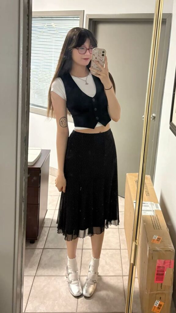 Who said a waistcoat needs a blazer? Layered over a simple white tee with a polka dot pleated midi and silver mary janes, this look is giving vintage secretary meets Y2K dream. The ruffled sock detail is so intentional it loops back around to being cool. This works because every piece has personality but none of them compete. Basically a masterclass in mixing sweet and sharp.