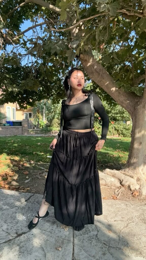 All black everything, but make it interesting. The long sleeve crop with ribbon tie details against that voluminous ruched maxi skirt is so romantically dark it almost hurts. Ballet flats keep it from tipping into costume territory, which is basically the smartest move here. If you love drama but hate looking like you tried too hard, this one is literally for you.