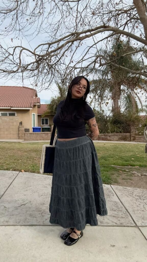 This is the outfit for someone who runs cold in every sense. The fitted black turtleneck crop paired with a dark tiered denim midi skirt and shearling tote feels so considered. Mary Jane flats in patent black tie it all together perfectly. I mean, the proportions alone. Okayyy. Add round glasses and you’ve got instant mysterious literary girl coded energy going on.