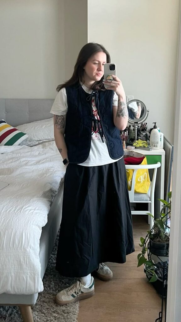 Quilted navy vest, white tee, a fun printed neck scarf, dark maxi skirt and Sambas? So effortlessly good. The scarf adds that one weird detail that makes people actually stop and look. Usually this kind of layering can feel clunky but the proportions here are so clean it just works. This is the outfit you wear when you want people to think you dress like this every single day.