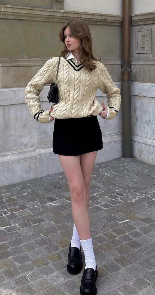 The cream cable knit over a white collar with a black velvet mini is giving studied effortlessness. White socks and chunky loafers lock in that old money prep school energy without being too on the nose. The little black crossbody keeps it sharp. I mean this look has been on a European cobblestone street before and it shows. So wearable, so covetable.