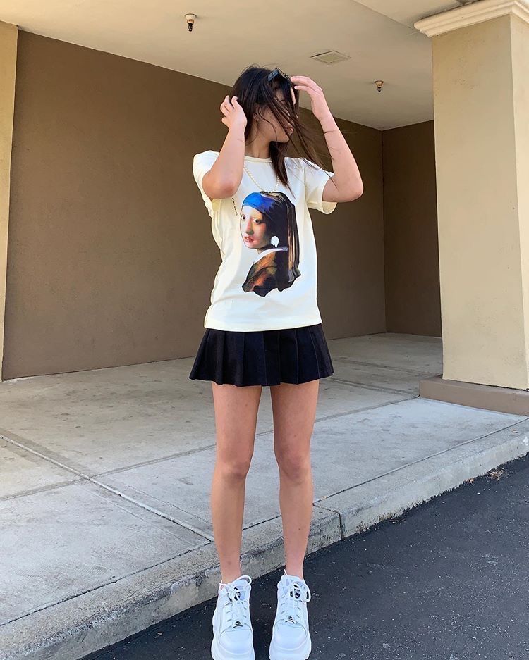Honestly the art tee is doing so much here. Wearing a classic painting on a cream tee with a pleated black mini and white platform sneakers is such an unbothered flex. It says I know things but make it cute. This combo works because the top is visually interesting enough that the simple skirt and sneakers just let it breathe. So easy, so replicable.