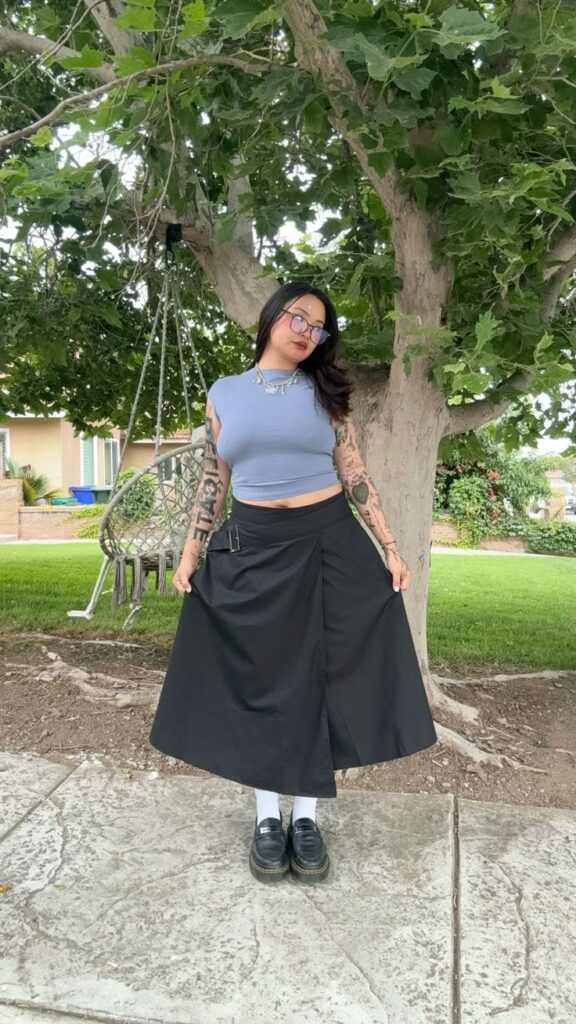 Honestly, the belted wrap detail on this black midi does all the heavy lifting. Pairing it with a baby blue crop and chunky loafers with white socks gives the whole look this effortlessly cool, soft goth energy. The layered silver necklaces are chef’s kiss. So wearable, so intentional. You ought to try this combo if you want to look put together without actually trying.