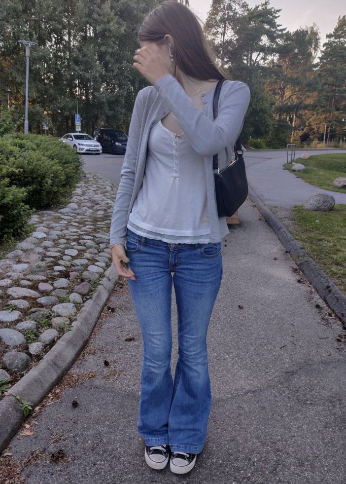 A fitted cami under an open cardigan with flares and Converse is giving very much that early 2000s nostalgia, but in the best possible way.