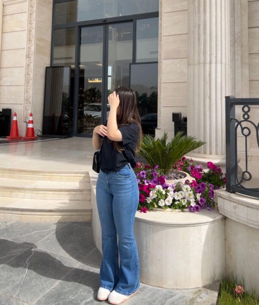 A fitted dark tee tucked into high waist flares with clean white sneakers and a small crossbody is giving effortless cool girl and honestly that’s all you need sometimes.