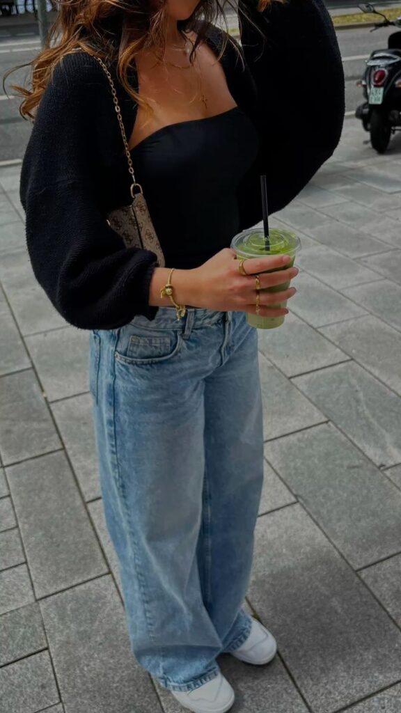 A black square neck top under a black oversized cardigan with light wash baggy flares and white sneakers is clean, cool, and requires zero thought.