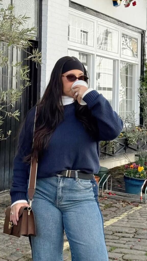 So layering a collared shirt under a chunky knit sweater with flares and a structured crossbody is giving that elevated preppy energy that feels so fresh right now.