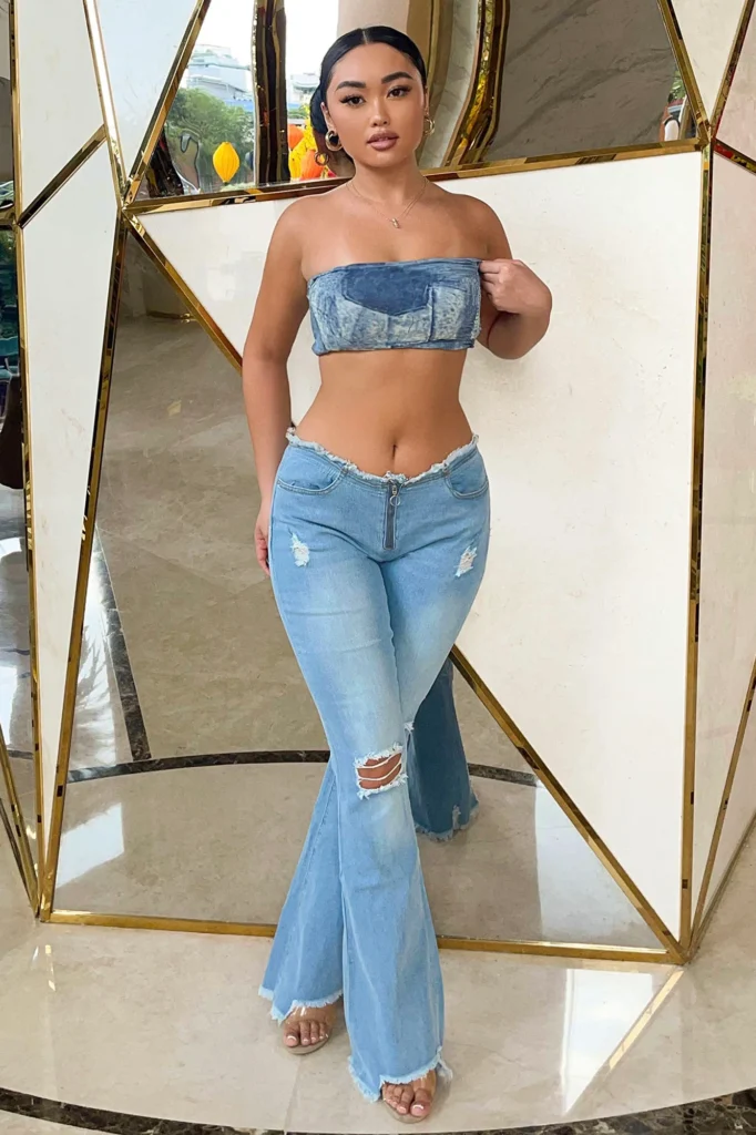 Low rise ripped flares with a denim corset style top is giving full Y2K summer and you should absolutely not shy away from it.