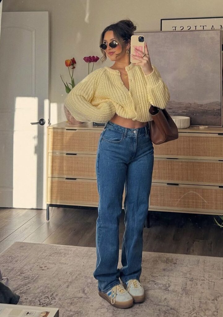 Okay this one is so good. A cropped chunky knit cardigan in a soft yellow with mid wash flares and chunky sneakers is giving sunshine and effortless style all in one look.