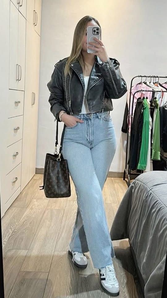 A black moto jacket over a white tee with light wash flares and some sporty sneakers is one of those combinations that looks cool on literally everyone.
