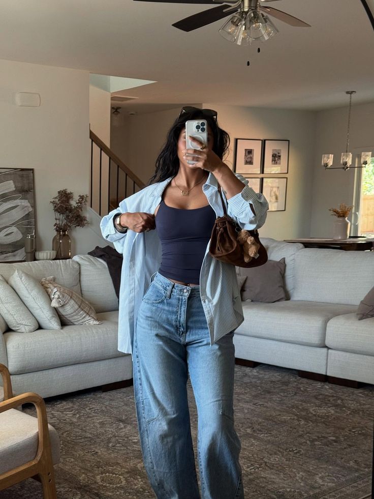 A navy tank, an oversized button down worn open, and light wash flares with a brown suede bag is the kind of outfit you throw on in five minutes and then get compliments on all day.