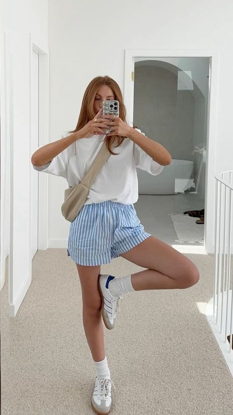 Loose white tee, light blue stripe boxer shorts, white Gazelle trainers with white socks and a neutral shoulder bag is basically the platonic ideal of a simple summer outfit. The fact that it is so clean and uncluttered is what makes it photograph so well. If you are building a summer wardrobe from scratch, stripe shorts and a white tee are genuinely where you should start.