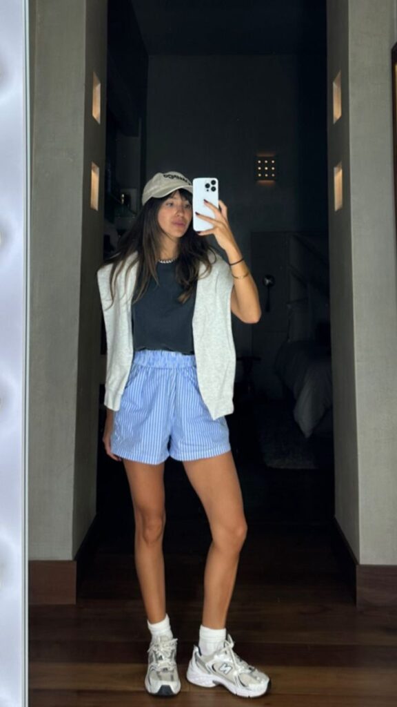 Sleeveless grey hoodie vest layered over a dark fitted crop tee with blue stripe boxer shorts, New Balance trainers, white socks and a branded cap is so clever because the sleeveless layering piece adds dimension without adding warmth. This one is basically perfect for early evening or whenever the temperature dips slightly but you are not ready to commit to a full jacket just yet.
