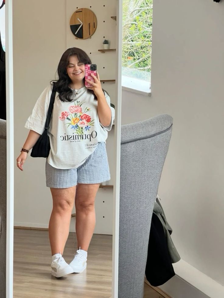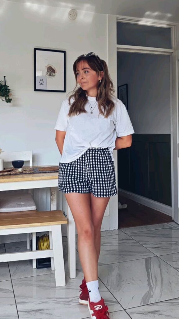 Honestly, a floral “Optimistic” graphic tee with blue mini gingham shorts, white trainers, white socks and a black crossbody bag should not work quite this well but it absolutely does. The warm tones in the graphic pull out the warmth in the check and the whole thing looks intentional rather than thrown on. For anyone nervous about mixing print and graphic, this is your proof of concept.