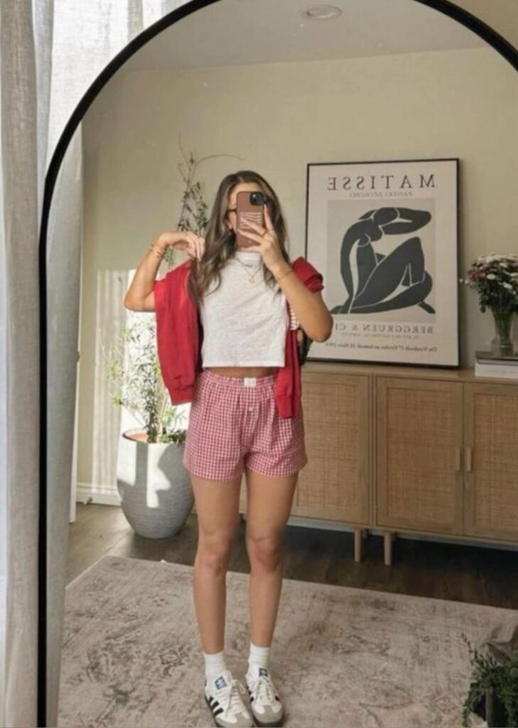 Oversized white graphic tee, red gingham boxer shorts, Adidas Sambas with white socks and a canvas tote bag is honestly the most pleasurable kind of lazy summer outfit. The pearl bracelets and the rose phone case are very much part of the aesthetic. This is the look you wear when you are grabbing a coffee and somehow end up photographed anyway.