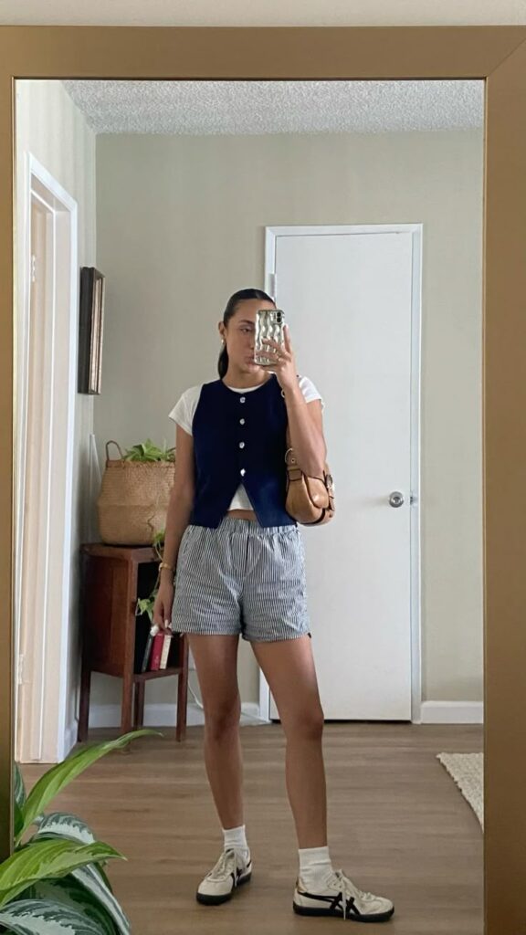 Layering a navy button through knit vest over a white baby tee with thin stripe shorts, Onitsuka Tiger trainers, white ankle socks and a tan half moon bag is so quietly chic. The colour story between the navy and the stripe shorts is such a smart call. You ought to try the vest over a tee formula with your own boxer shorts this summer because it genuinely elevates the whole thing instantly.