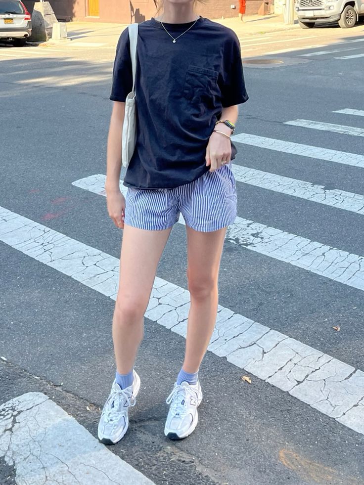 Navy pocket tee, light blue pin stripe shorts, white New Balance 530s and blue ankle socks with a soft white shoulder bag is so minimal and so correct. There is literally nothing extra happening and that is exactly why it works. The matching blue in the socks to the shorts is the one small detail that makes it look like she planned it, even if she did not.