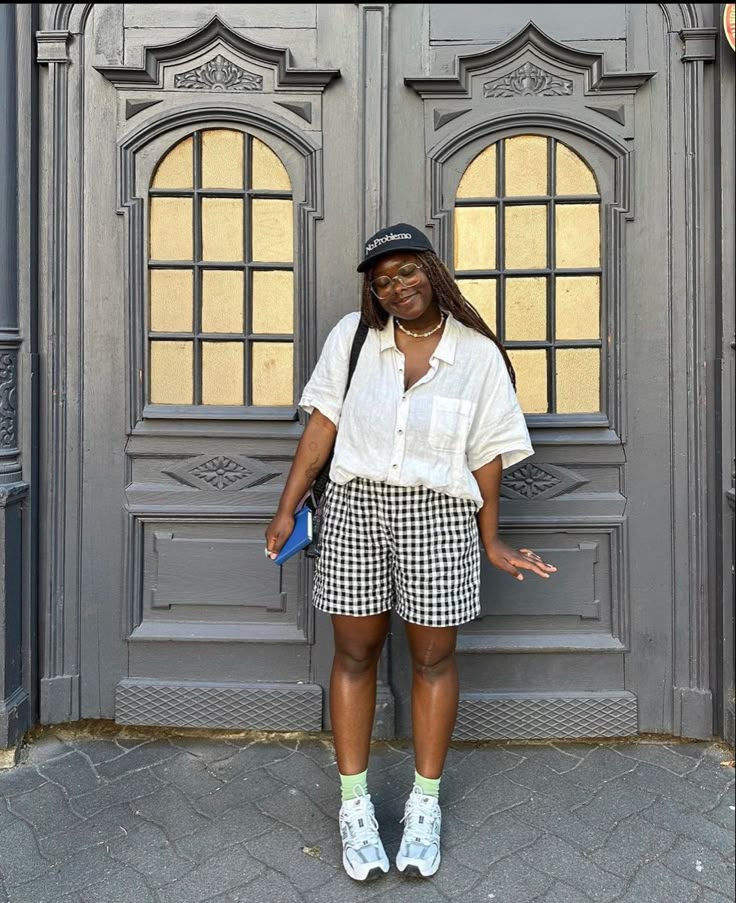 An oversized linen shirt left completely open over black and white gingham shorts with a gold choker, clear glasses, mint green ankle socks and chunky trainers is such a relaxed but thought through combination. The blue crossbody adds a pop of contrast that stops it from feeling too monochrome. This is the ideal outfit for a summer day when you genuinely want to feel comfortable but still look like you have a point of view.