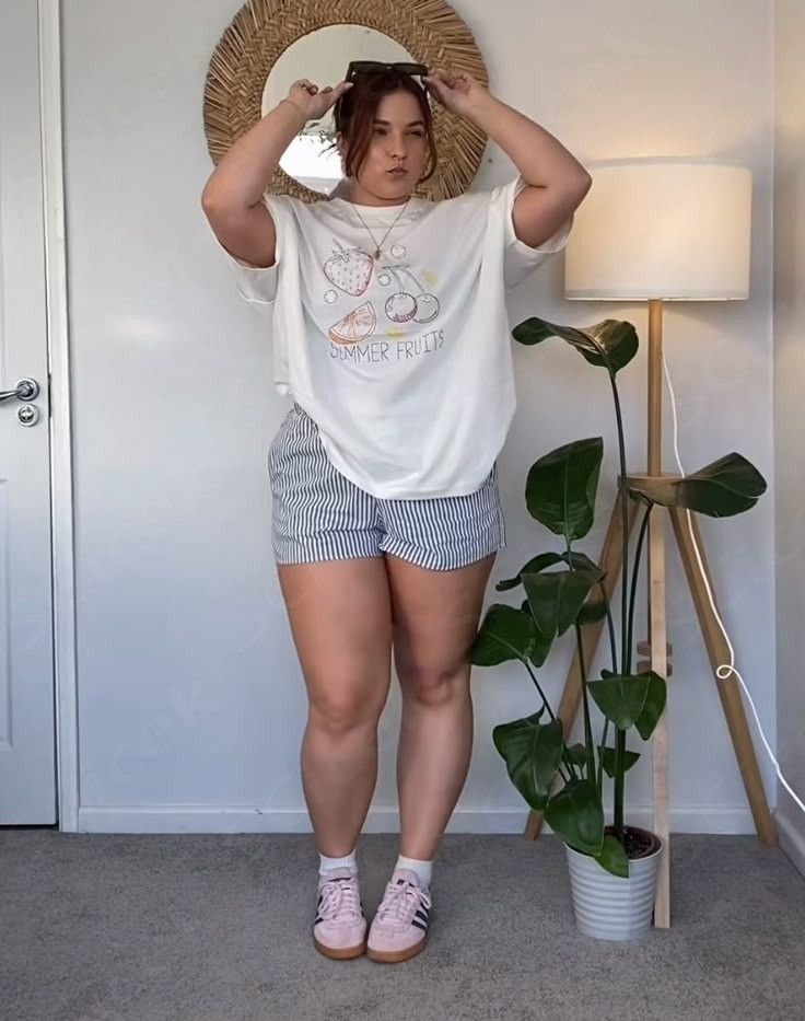 There is something so breezy and effortless about a fruit graphic tee worn loose over thin stripe boxer shorts with pink Adidas Sambas and white ankle socks. The pearl pendant necklace is such a small detail but it pulls the whole look together. This combo works because the softness of the stripes balances the playfulness of the graphic perfectly.