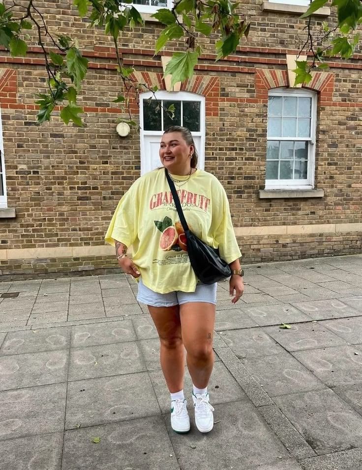 An oversized lemon yellow grapefruit graphic tee worn as a dress over grey denim biker shorts with white Air Forces, white crew socks and a black crescent bag is such a fun, relaxed approach to a summer day look. The stacked rings and gold watch keep it from feeling too casual. This is the formula for anyone who runs warm and refuses to compromise on style.