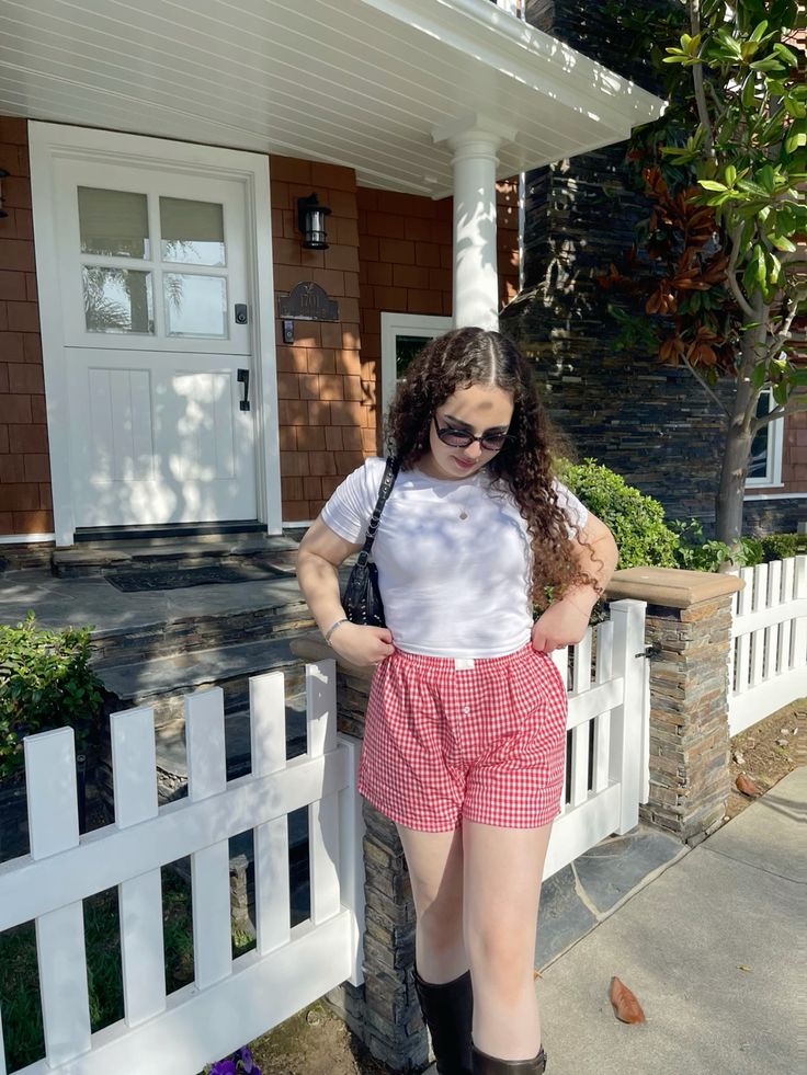 Red gingham boxer shorts tucked with a fitted white baby tee, tall black rain boots and a small black crossbody bag is unexpectedly brilliant. You would not think to pair something that summery with knee high boots but the contrast is exactly what makes it interesting. The curly hair and vintage sunglasses seal it. This one is giving very much coastal town in an overcast kind of way.