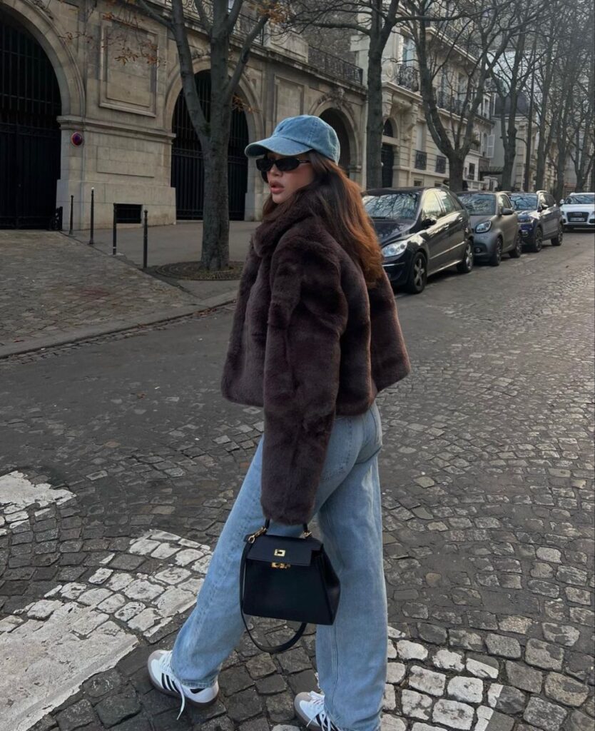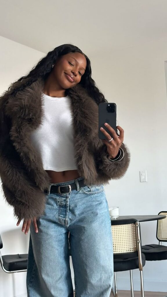 Showing a bit of skin under all that warmth creates an interesting contrast. A fitted crop top under your brown fur with high waisted jeans brings a younger, more playful energy to the look. It’s unexpected in a good way.