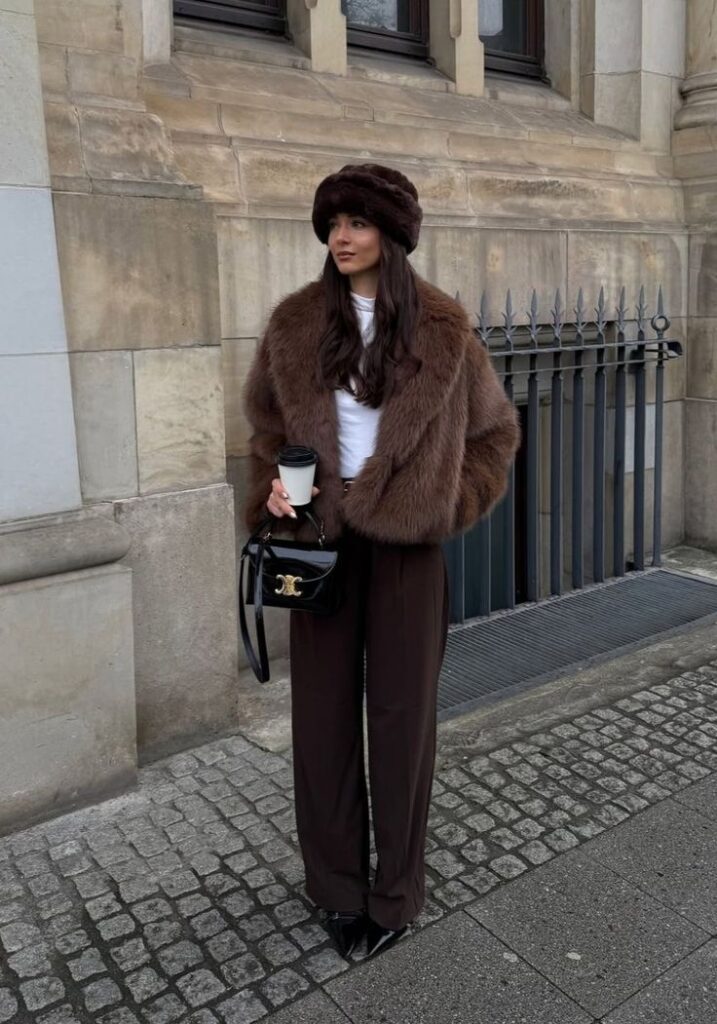 Think chocolate brown fur over a camel sweater with brown pants outfits underneath. The tonal dressing feels very intentional and sophisticated.