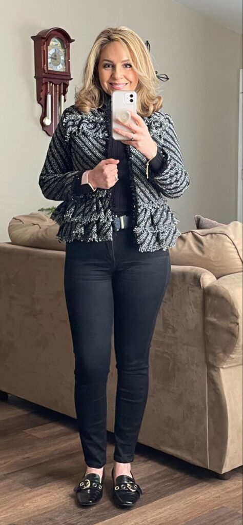 That boucle fringe jacket in monochrome tones is a genuine statement piece and it does not need much support. A fitted black turtleneck underneath, slim black jeans and gold buckle loafers keep the rest clean so the jacket stays the focal point. This is the casual outfit for when you want to look like you absolutely have your fashion life sorted. And you do.
