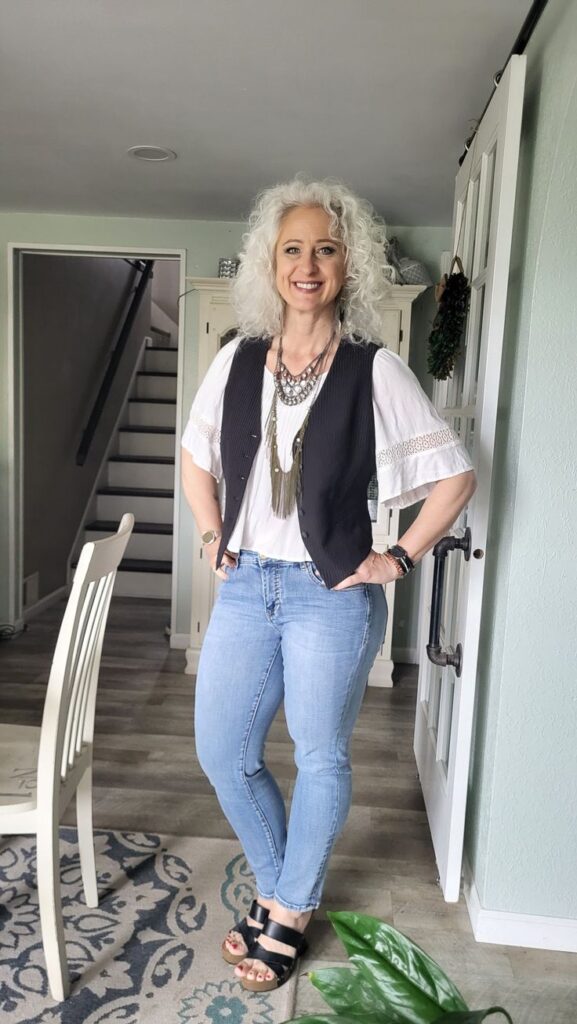 So a pinstripe waistcoat over a white broderie anglaise top with light wash jeans is giving serious cool French girl energy. The layered tassel necklace adds boho warmth so it never tips into corporate territory. Black platform sandals ground it all without adding too much weight to the bottom. An absolutely brilliant casual outfit that looks considered without trying too hard.