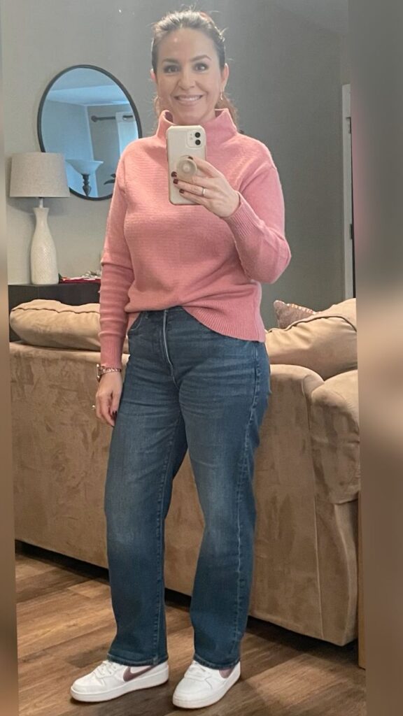 For the person who wants casual to feel genuinely cosy and pulled together, a pink turtleneck with straight leg mid wash jeans and white trainers is giving warm weekend energy. It is basically the outfit for a coffee run, a browse around the shops, a lunch with friends. Comfortable and stylish are not mutually exclusive and this look is proof of that every single time.