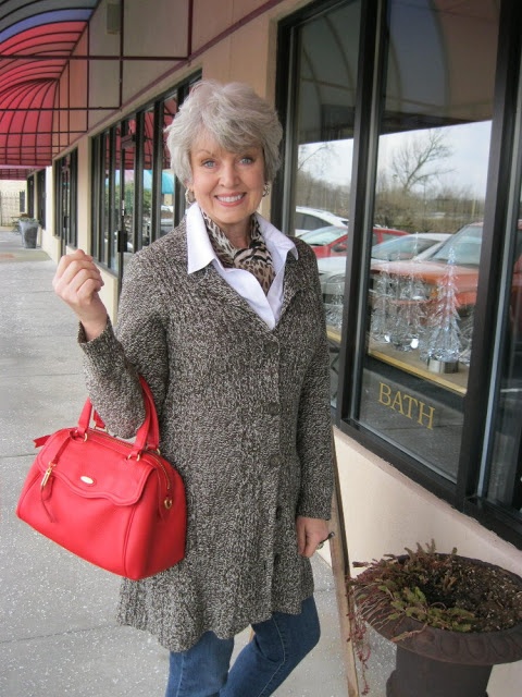 Sometimes one bold accessory is all a neutral outfit needs. A textured grey swing coat layered over a white shirt with a leopard print scarf at the neck is classic and refined. That red structured bag injects colour and personality without disrupting the elegant base. This is the formula for looking put together on an ordinary day when you still want to feel great.