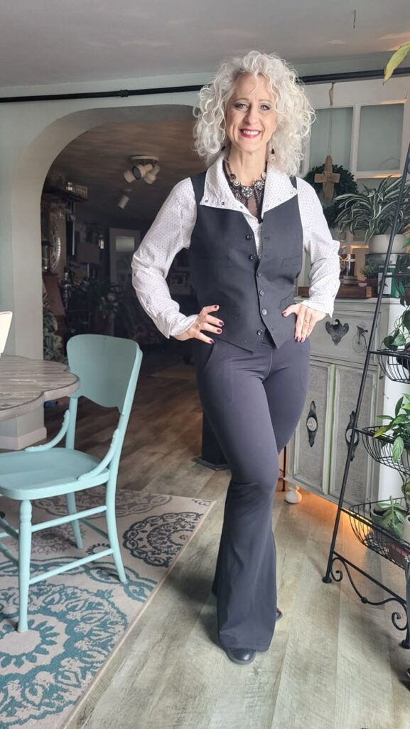 You know what is having a serious fashion moment right now? The waistcoat over a shirt combination. Dark charcoal waistcoat layered over a white dotted blouse with flared trousers is sharp and confident. The long pendant necklace and statement earrings add personality. This is polished casual at its absolute best and it works for basically any daytime occasion you can think of.