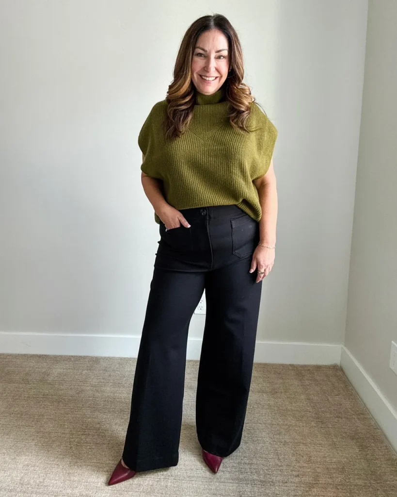 Olive green and burgundy should not work as well as they do together, and yet here we are. A chunky ribbed knit vest in this rich earthy tone over wide leg black trousers creates real visual interest. The burgundy pointed toe heels are the detail that makes this outfit click into place. So good for anyone wanting to look current without chasing trends.