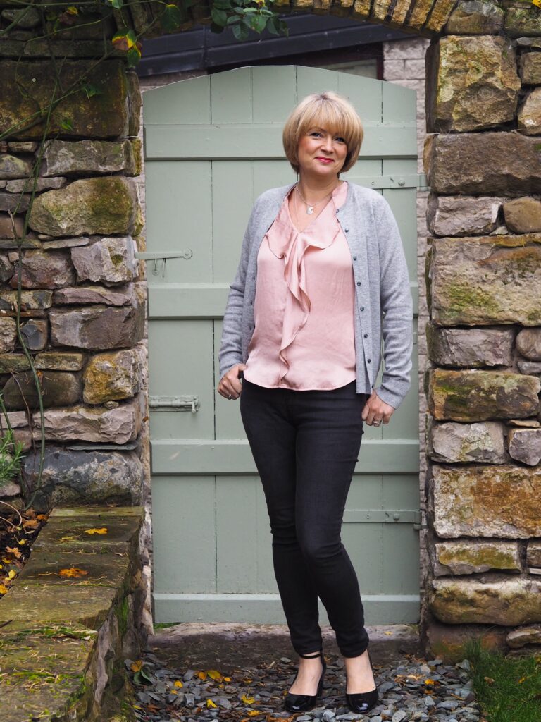 Pink and grey together is such an underrated combination and this outfit absolutely nails it. The ruffled satin blouse adds femininity while the grey cardigan keeps it grounded and practical. Black skinny jeans and patent block heels pull the whole thing together with just enough polish. This is your go to formula for looking effortlessly put together without overthinking it at all.