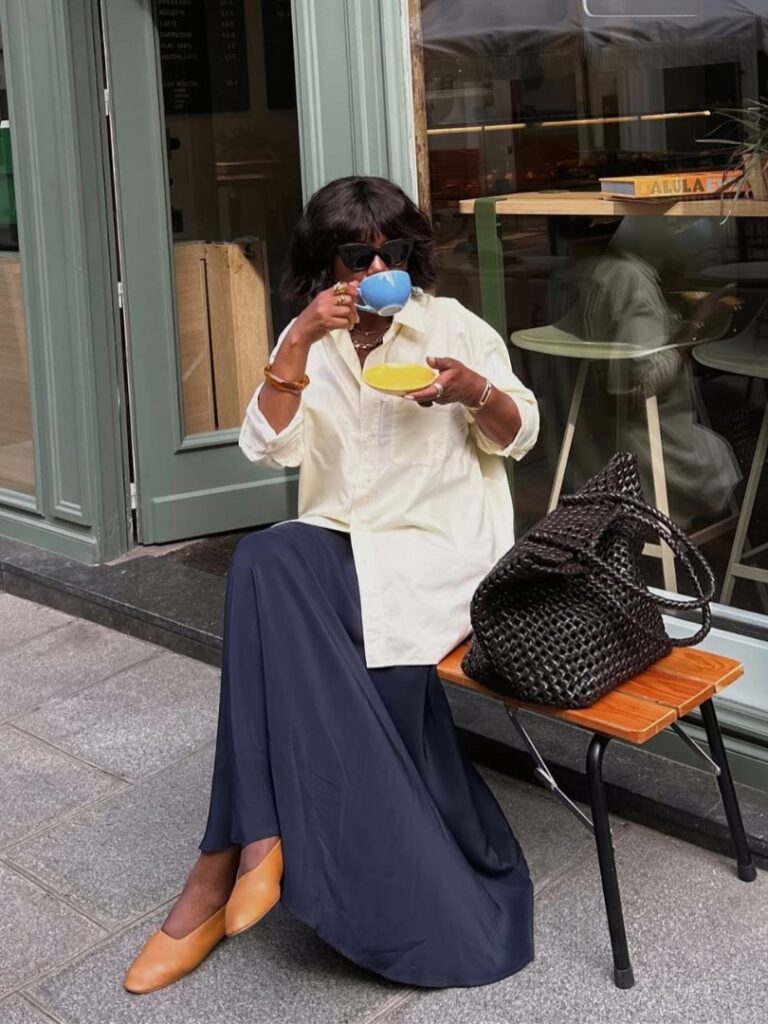 An oversized cream shirt untucked over a navy satin maxi skirt is one of the most effortlessly chic combinations for casual everyday dressing. The shirt billows in the right way and the satin skirt gives it a slight elevated feel without tipping into overdressed. Tan ballet flats and a woven leather bag keep the whole look grounded and genuinely relaxed. The sunglasses seal it.