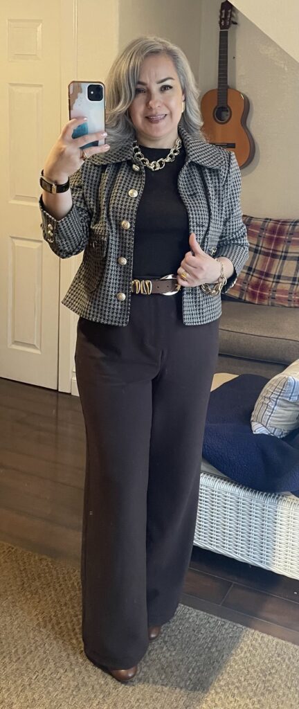 Houndstooth double breasted cropped jacket with gold button detail is so well considered. The chunky gold chain necklace mirrors the hardware beautifully, the black turtleneck and wide leg trousers underneath create a long sleek silhouette, and that tan belt with the gold buckle pulls everything into focus at the waist. Tan ankle boots and this look is completely editorial.