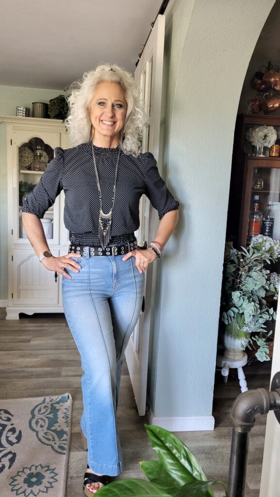 Flare jeans with a polka dot puff sleeve top is a combination that is playful and retro in the best possible way. But it is that studded belt cinching the waist that takes this from cute to genuinely great. A long tassel necklace adds vertical length and the black open toe sandals keep things light. This woman clearly knows exactly what she is doing.
