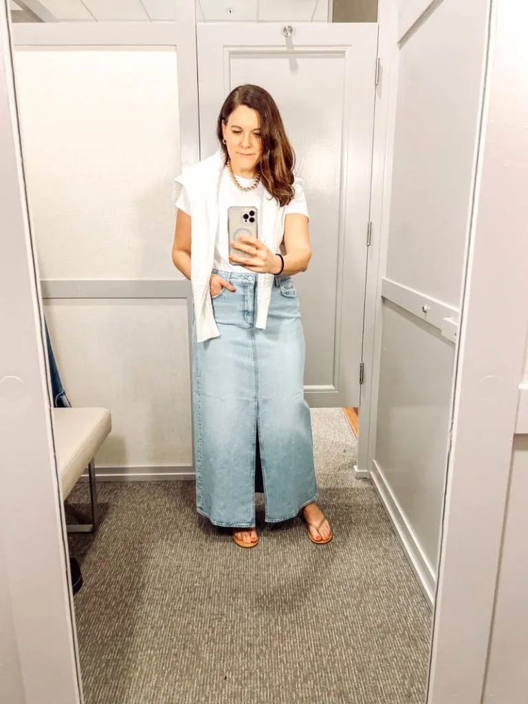 The denim maxi skirt trend is everywhere right now and this is honestly how you wear it well. A simple white tee tucked in, a chain necklace, tan slider sandals and a casually tied white layer at the shoulders for effortless interest. The front split adds movement without the skirt feeling restrictive. So easy to recreate and comfortable enough to wear all day.