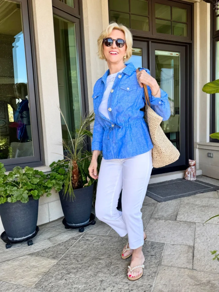 For casual dressing that still looks intentional, a utility jacket in cobalt blue over white cropped jeans is genuinely the formula. The cinched waist detail in the jacket creates shape so you are not drowning in the silhouette. A woven tote and embellished sandals keep it relaxed. This is the kind of outfit you throw on and immediately feel ready for anything.