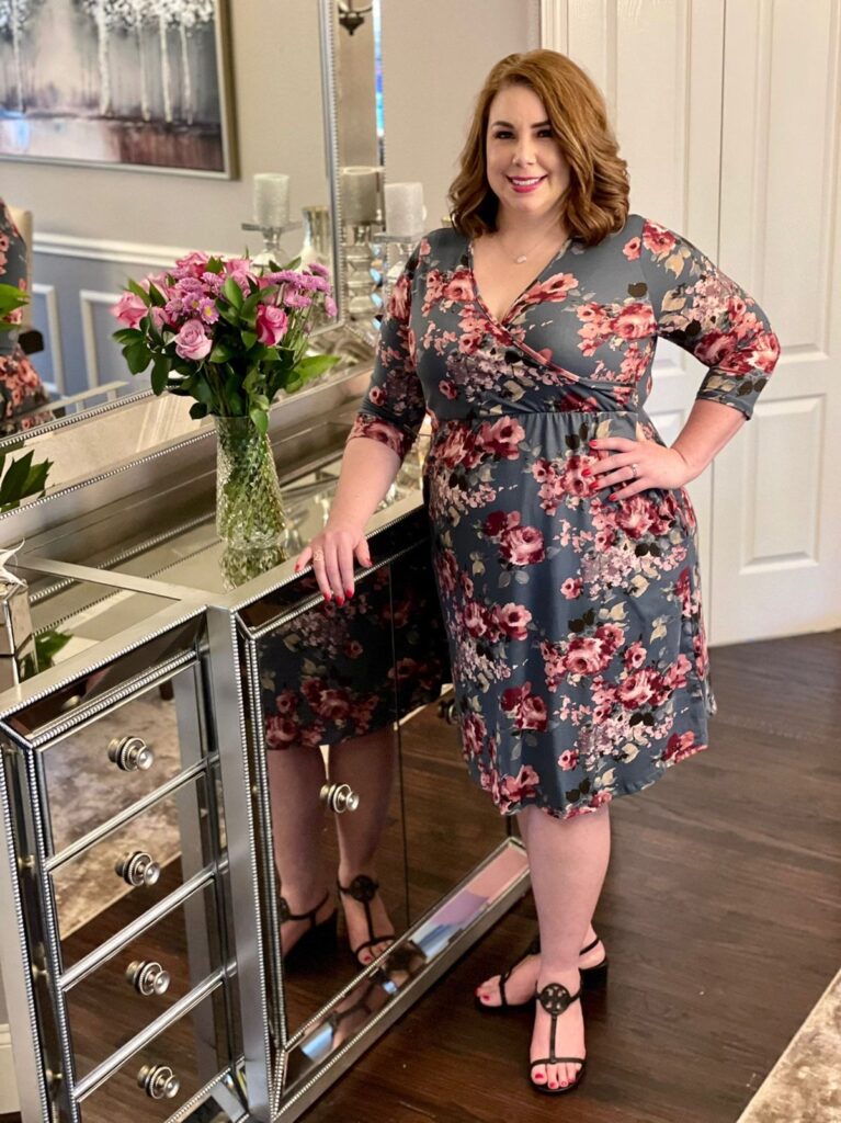 The dusty blue floral wrap silhouette is a flattering choice for this occasion and this one specifically does everything right.