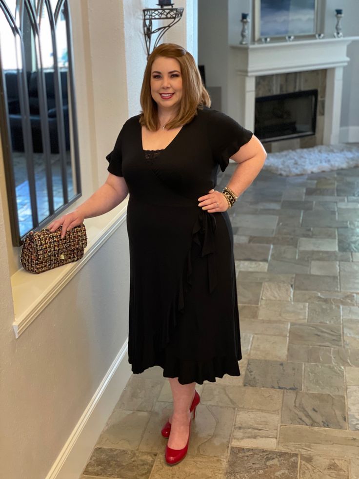 The v neckline and wrap waist create shape without being restrictive and the three quarter sleeve adds polish. Strappy black heeled sandals ground it.
