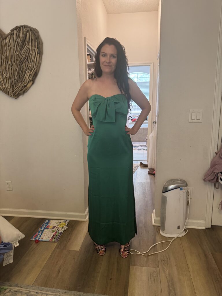 Emerald green with a structured bow detail at the bust is a colour and silhouette combination that is genuinely stunning.