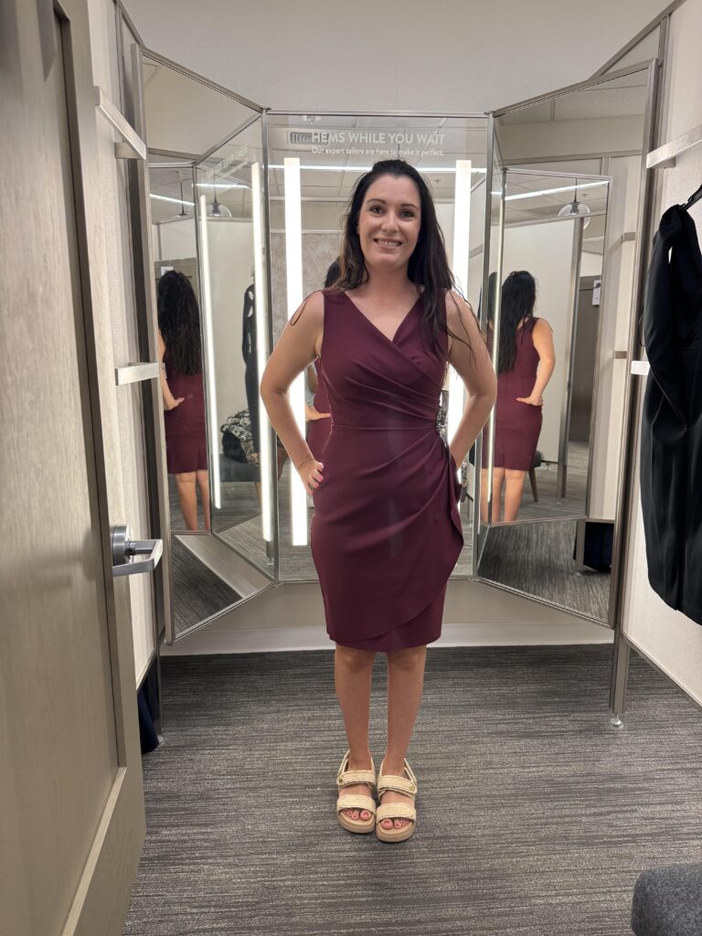 The draping and ruching on this wine coloured knee length dress is doing serious figure work in the most flattering way possible.
