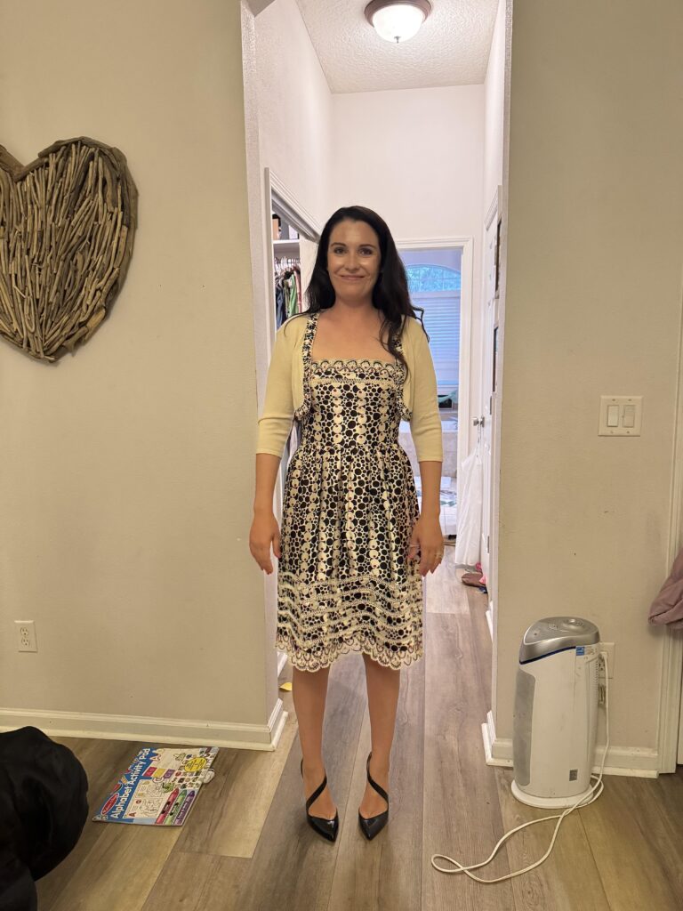 The subtle shimmer catches the light beautifully without going full disco ball. A polka dot clutch and gold pumps add personality without competing with the dress.