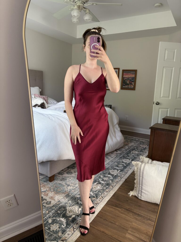 So there is something incredibly chic about a deep wine satin slip dress on the bias cut. It moves beautifully and the colour is rich enough to feel formal without being heavy.