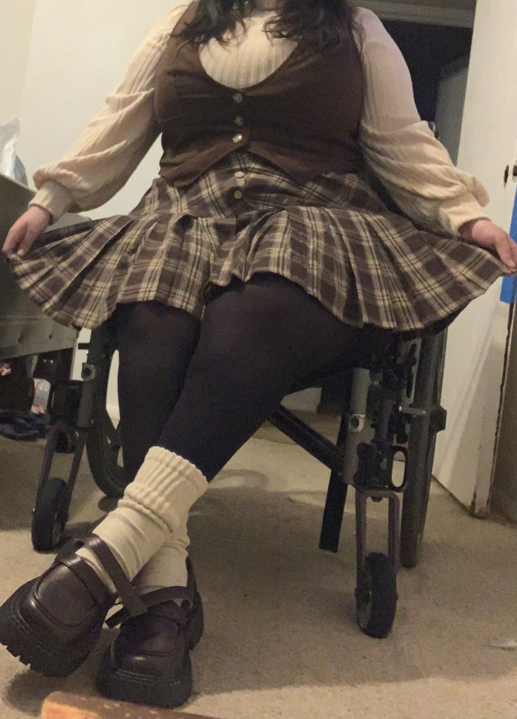 This one is genuinely stunning. A brown and black gingham oversized coat worn over a white ruffled blouse, grey mini skirt, black tights, frilly socks, loafers, and a long brown fuzzy scarf draped dramatically over the whole thing.