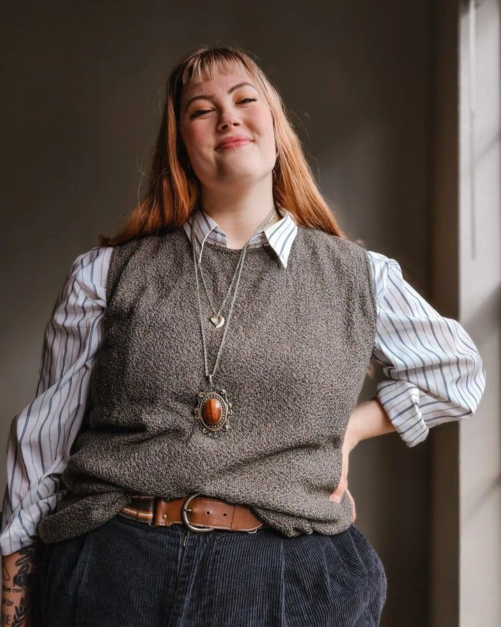 There’s something so specifically bookish about a striped shirt collar peeking out from under a textured knit vest.