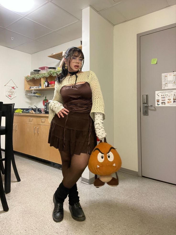 A chocolate satin mini dress ruched and fitted, with an open weave cream crochet bolero layered on top, black tights, chunky boots, and a novelty plush bag is giving whimsical academic in the best possible way.