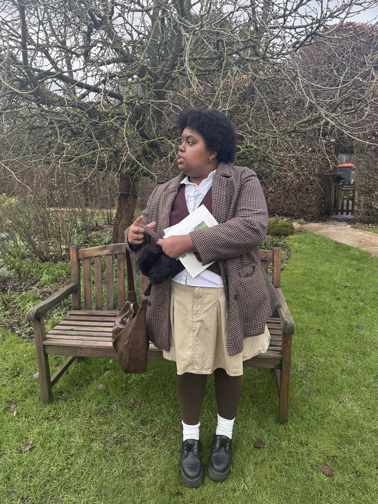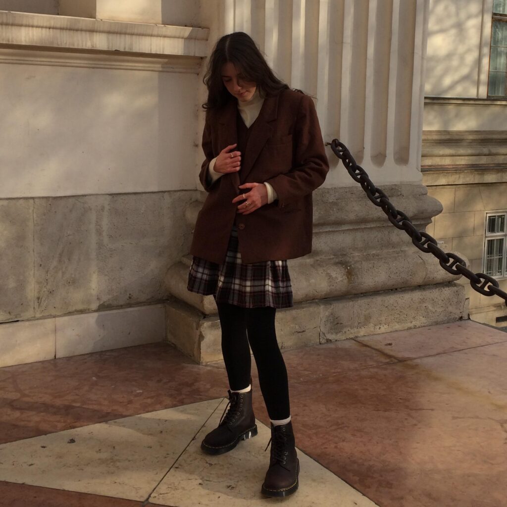 Moody. Quiet. Pulled together without trying. A cream turtleneck under an oversized chocolate blazer with a brown plaid mini skirt, black tights, white socks, and chunky lace up boots is one of those combinations that photograph beautifully and wear even better.