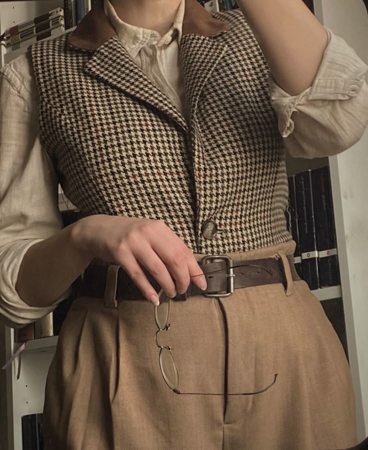 A houndstooth vest layered over a cream linen shirt with rolled sleeves, wide camel trousers, a thick brown leather belt, and reading glasses held in hand in front of a bookshelf.